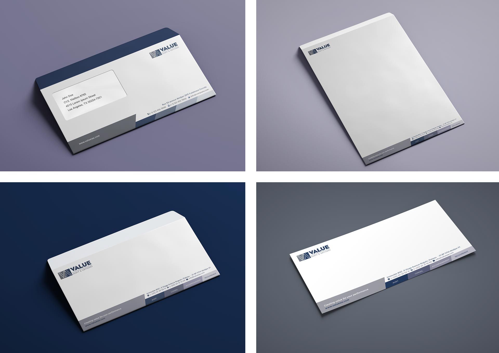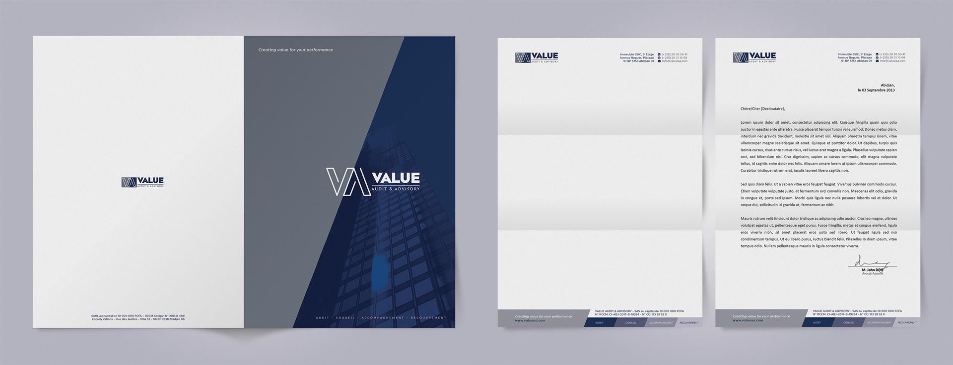 Réalisation du logo, de la charte graphique et de la papeterie de Value Audit & Advisory, une jeune entreprise spécialisée dans l'Audit et la comptabilité, basée à Abidjan