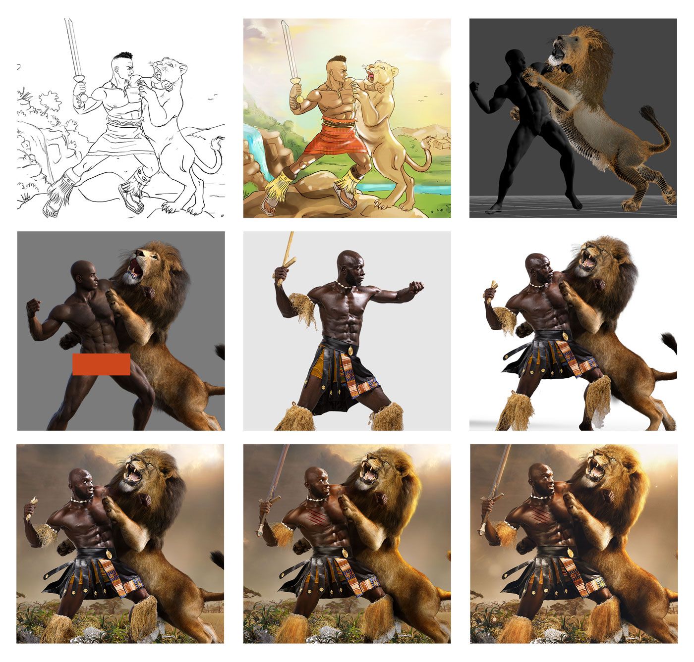 Les combats humain vs lion m'ont toujours fascinés. J'ai donc imaginé cette scène. En plein coeur de l'Afrique, ce jeune guerrier, qui voulait tant faire ses preuves en tant qu'homme et impressionner toute sa tribu, se lance dans une quête sans merci pour tuer un lion mangeur d'hommes.