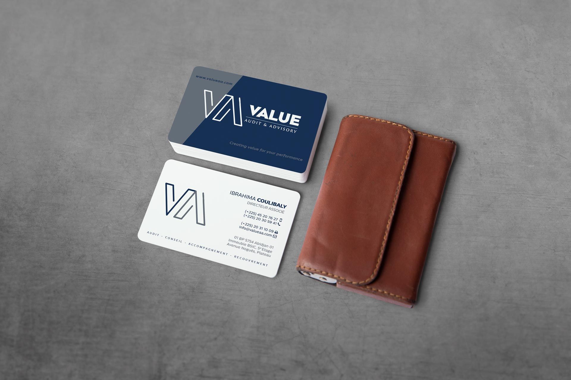 Réalisation du logo, de la charte graphique et de la papeterie de Value Audit & Advisory, une jeune entreprise spécialisée dans l'Audit et la comptabilité, basée à Abidjan